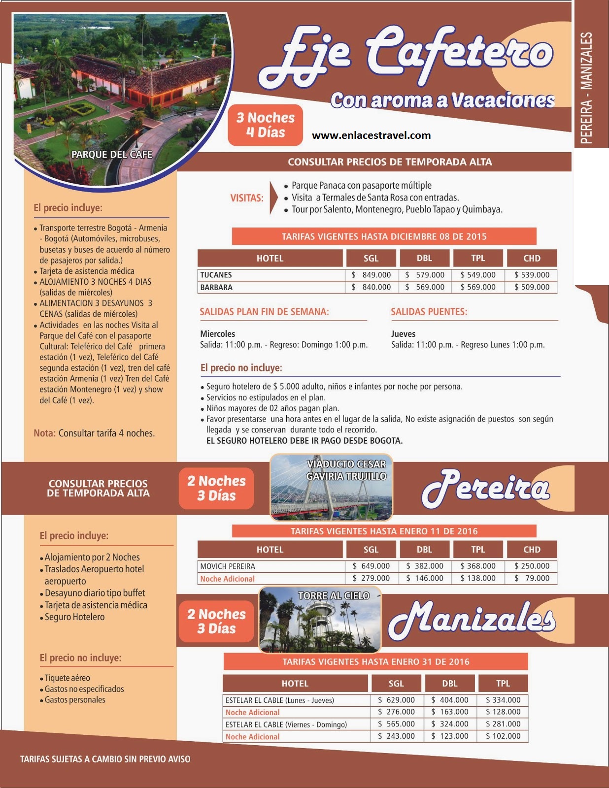 Arme su plan. Vea hoteles y tarifas.Parque Nacional del Café. Pereira y Manizales