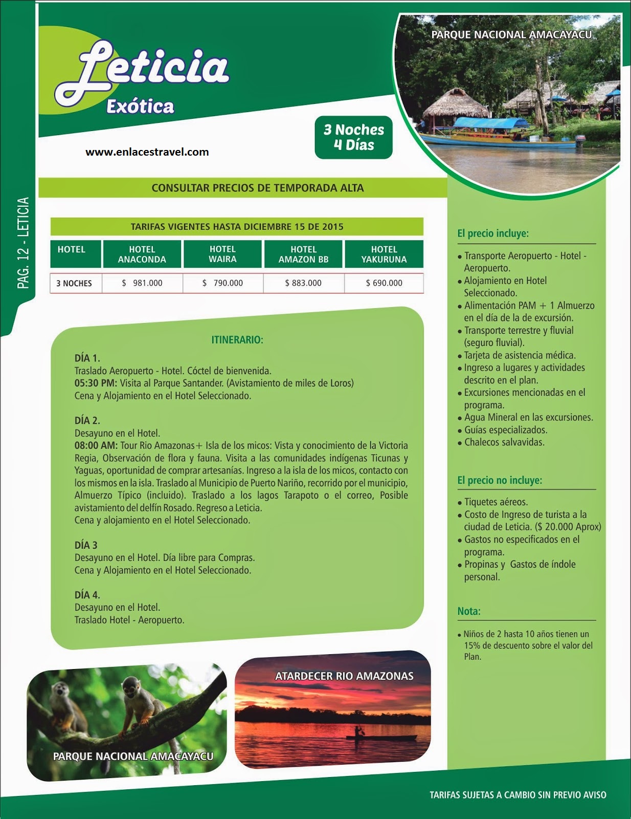 3 noches 4 días. Arme su plan. Conozca hoteles y tarifas. Tour por el río Amazonas. Observación de Fauna y Flora.