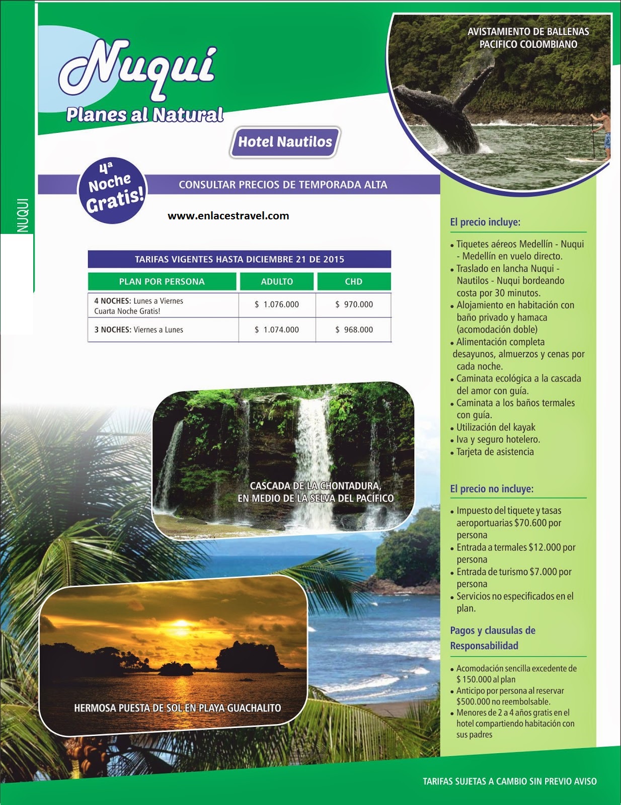 La 4a. noche es gratis. Tiquetes aéreos Medellín - Nuqui - Medellín. Expedición en el Nautilus. Alimentación completa.